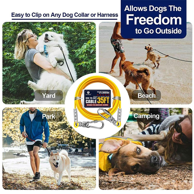 - Strong Stainless Steel Cable --- 35 feet size long, made of stainless steel wire 5mm in diameter with PVC coating, high tensile strength, impact toughness, corrosion resistance, Double crimp for stronger ends, our heavy duty dog cable has break strength of 1000 pounds. WATFOON chew proof tie-out cable provide more space for freely movement while ensuring your pets safety