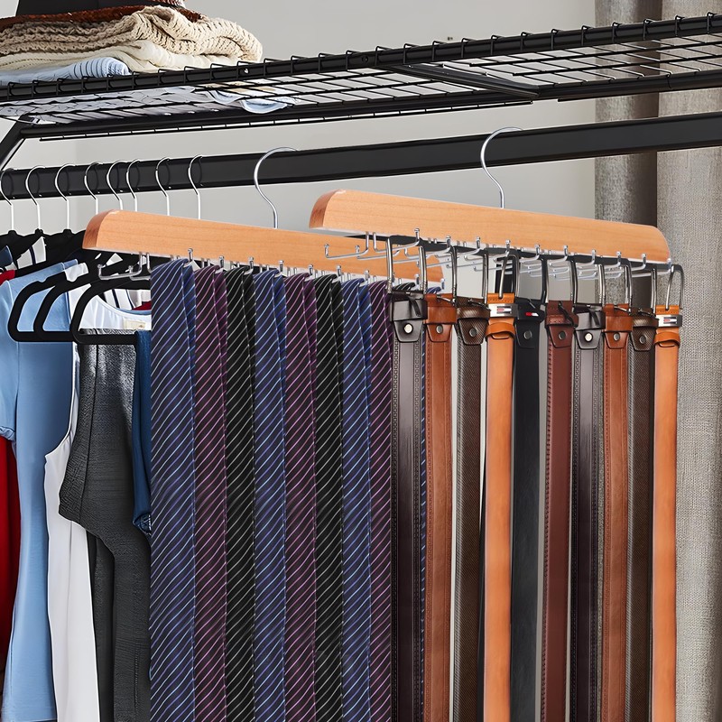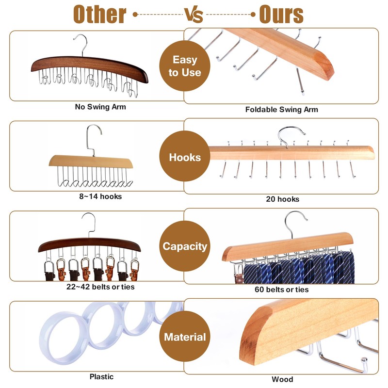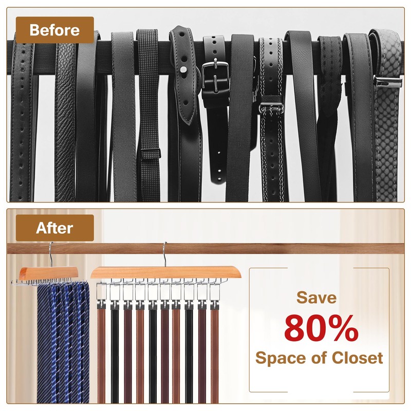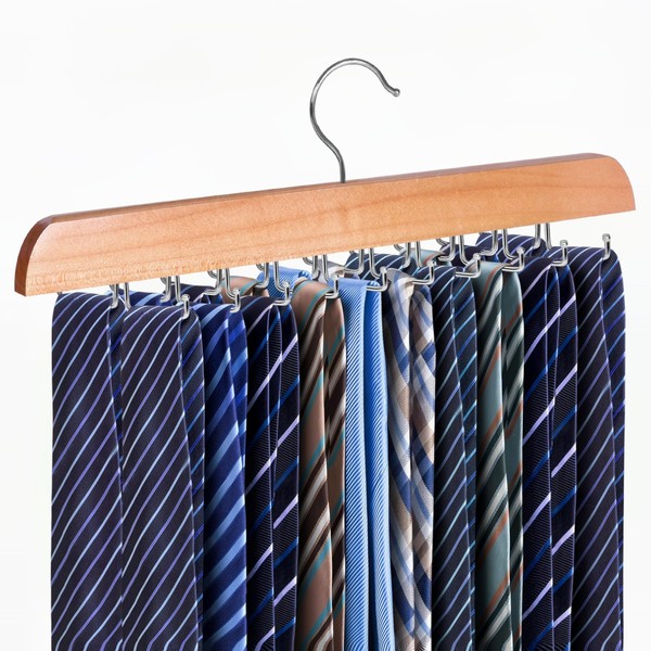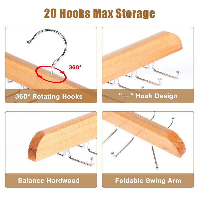 Cycleacc Tie Rack Hanger for Closet, 2 in 1 Belt Tie Hangers with 20 Folding Hooks, 360 Degree Rotating Wooden Tie Holder Organizer for Men Ties Belts Scarves Tank Tops Accessories, Wood (1 Pack)