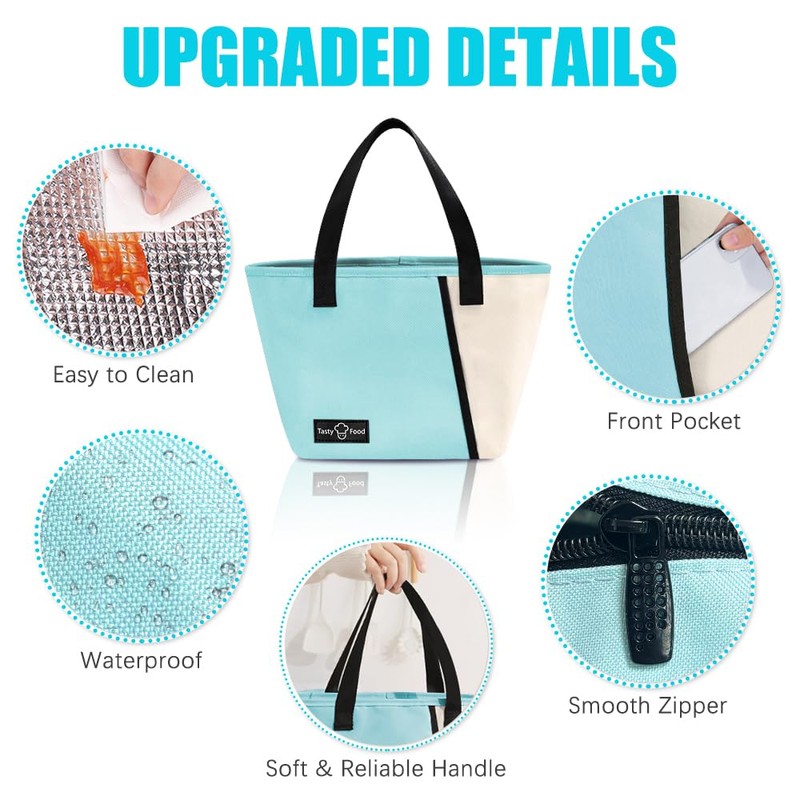 Reinforced and wider handles, sturdy, soft and comfortable; front pocket design, can put rice spoon, chopsticks and other small items; delicate zip is smooth and not snagging, providing you with a beautifully insulated lunch bag
