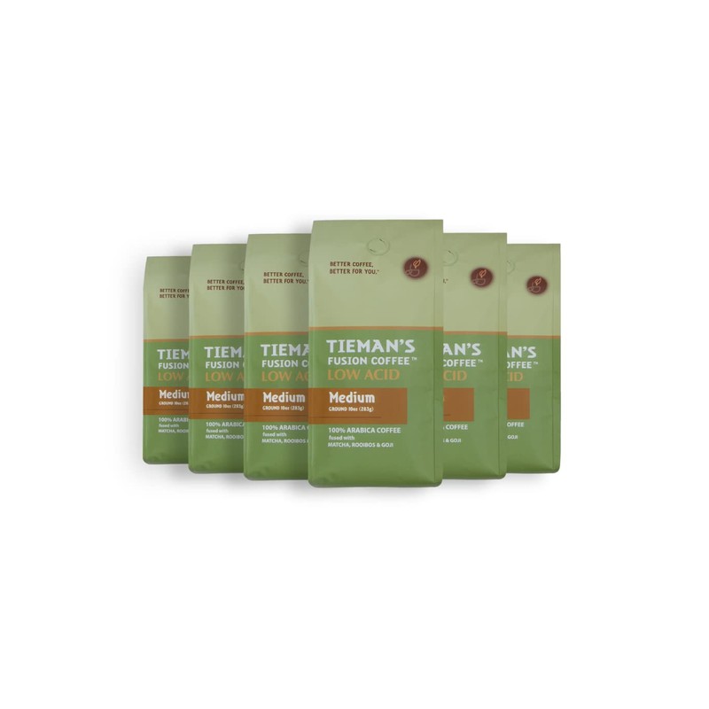 Tieman's Fusion Coffee, Low Acid Medium Roast, Ground, 10 ounce bag (pack of 6)