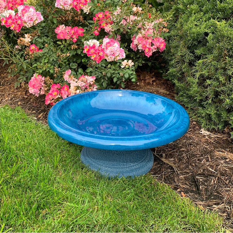 Tierra Garden Birds and Beyond Fiber Clay Birdbath, Gloss Bowl, Low-Profile Base, Azure Blue, 19" D x 7.5" H 6.5 lbs