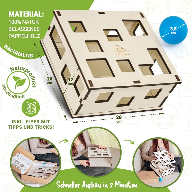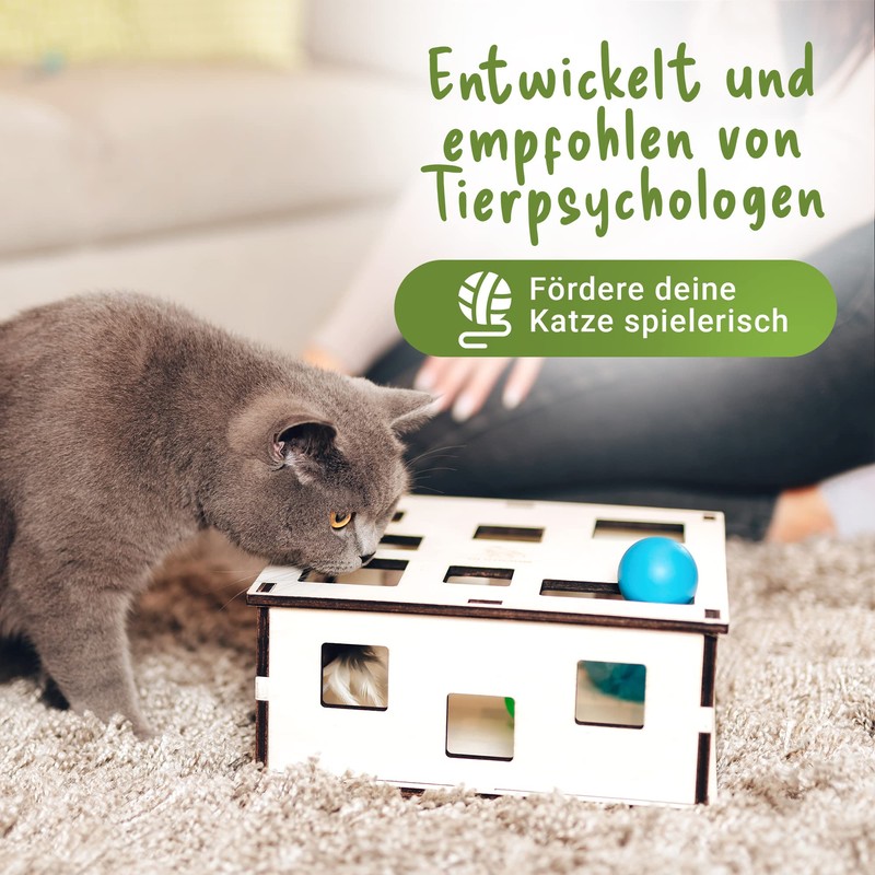 - Natural gaming. - Don't worry about harmful chemicals or plastic in cat toys. Our Tiertraum fumble box is made from pure natural materials that offer your cat a safe and healthy playing and nutritional experience. Pamper your cat with quality and naturalness