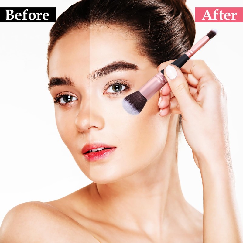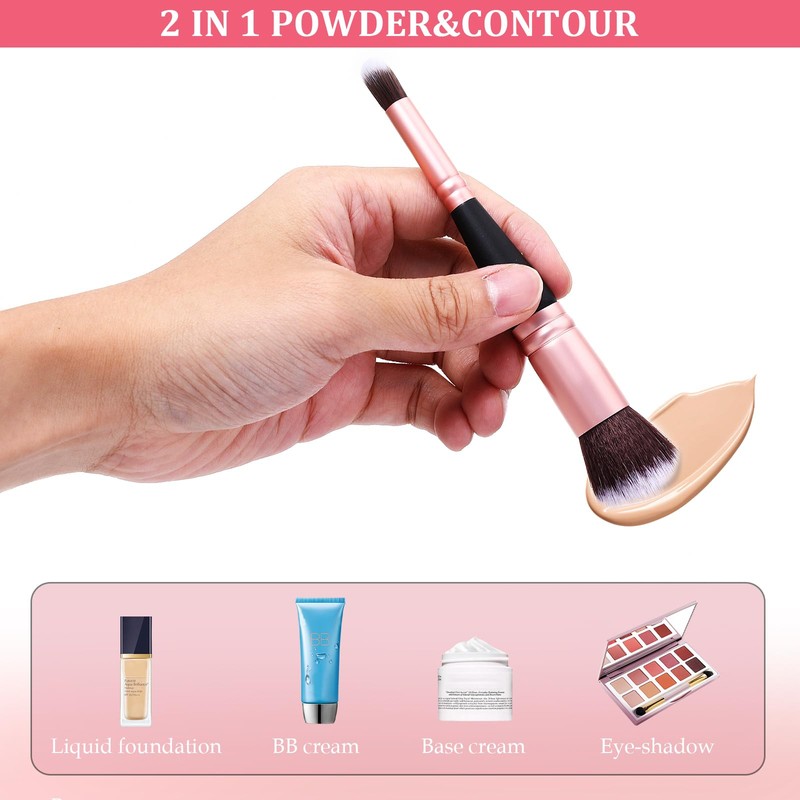 - Double-sided brush: This double-sided makeup brush is multifunctional. The larger side is a foundation brush with flat top and stiff bristles, but very soft ends and is good for applying foundation makeup over a large area. The smaller side is a concealer brush for applying concealer and blending contours, as well as for blending the underlying base layer on the eyelids and around the eyes.