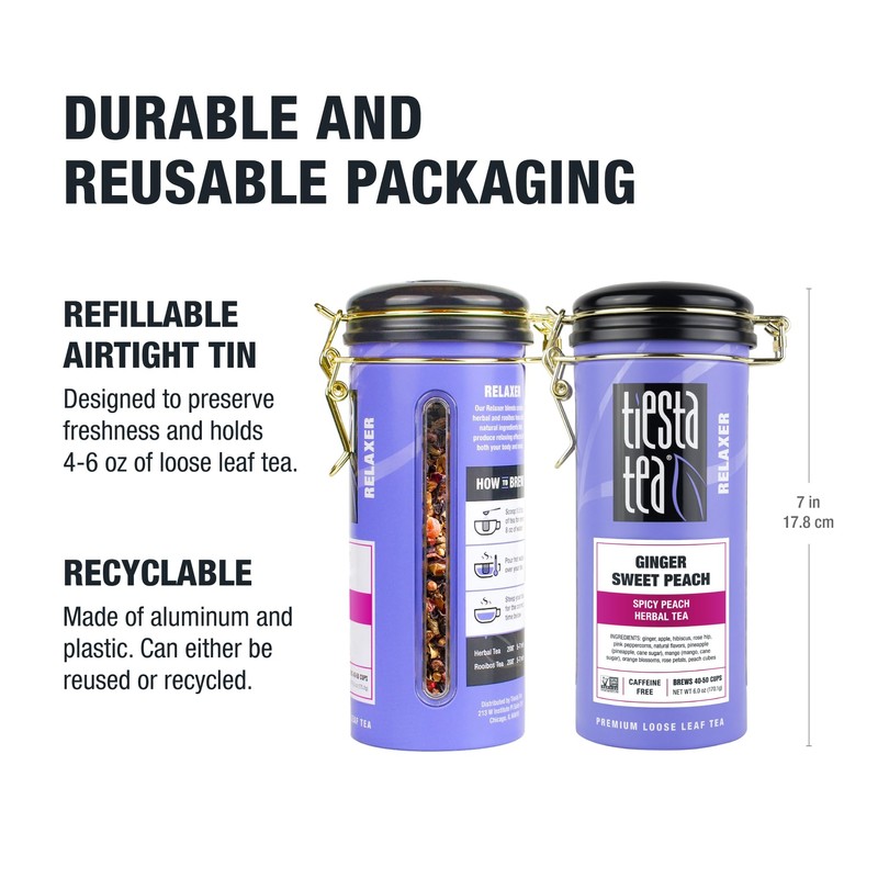 - REUSABLE TIN FOR FRESHNESS: Our Ginger Sweet Peach tea comes in a reusable tin that keeps your tea fresh for up to 50 cups. The stylish and functional tin makes it easy to store and display, while keeping your loose-leaf tea fragrant and ready to brew whenever you want.