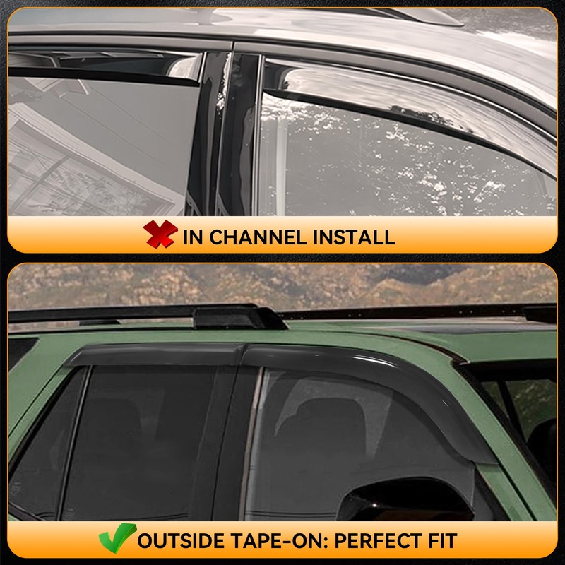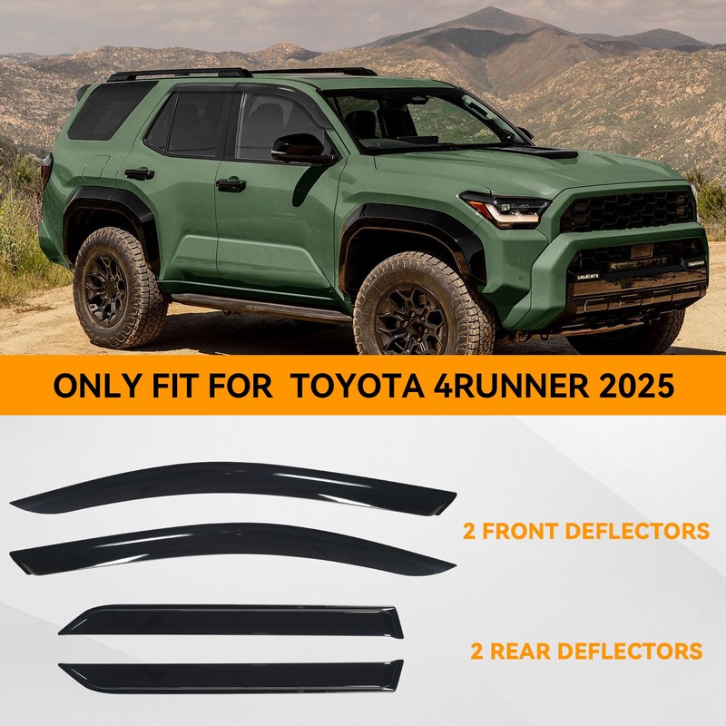 - Fitment: These tape-on window deflectors are specifically engineered to fit for Toyota 4Runner 2025 2026 Accessories. These 6PCS side window visors rain guards effectively deflect rain and wind away from the open windows, significantly improving driving comfort