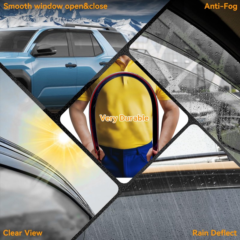 - Anti-fog, Low profile, Low-noise, and Efficient Design: With the lowest profile, Minimizes wind noise (buffeting) when windows are partially open. Allows windows to be opened slightly (1–2 inches) even in heavy rain, helping to prevent window fogging in rain. Does not interfere with window operation (superior to in-channel types)