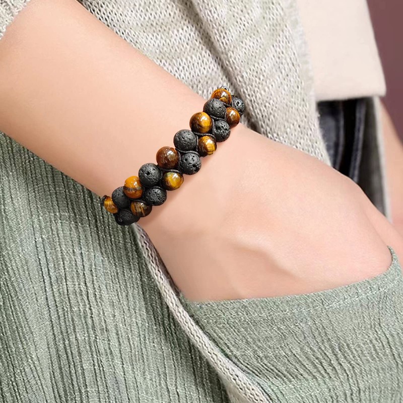 Tiger Eye Lava Rock Stone Bracelet Double Row Healing Wrap Adjustable Woven Bracelets Yoga Stone Beads Bracelets Meditation Relax Anxiety Bangle for Women Men
