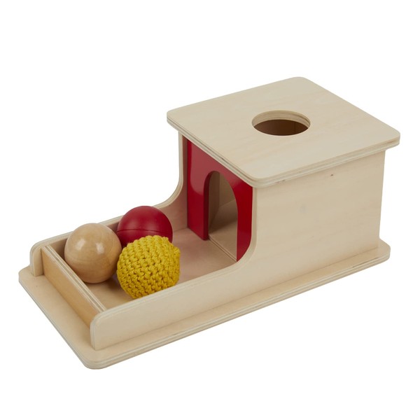 - The Object permanence Box with Tray is a beautiful material for sensorial aids for 6months to 3 years old to exercise children’s hand-eye coordination through simple movements. It contains a wooden box with tray and three balls 1.75inch (Wood Ball, Plastic red Ball,Braided yellow ball).