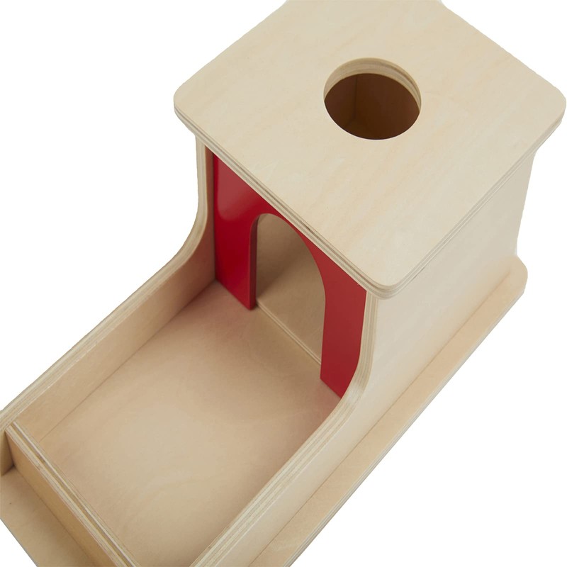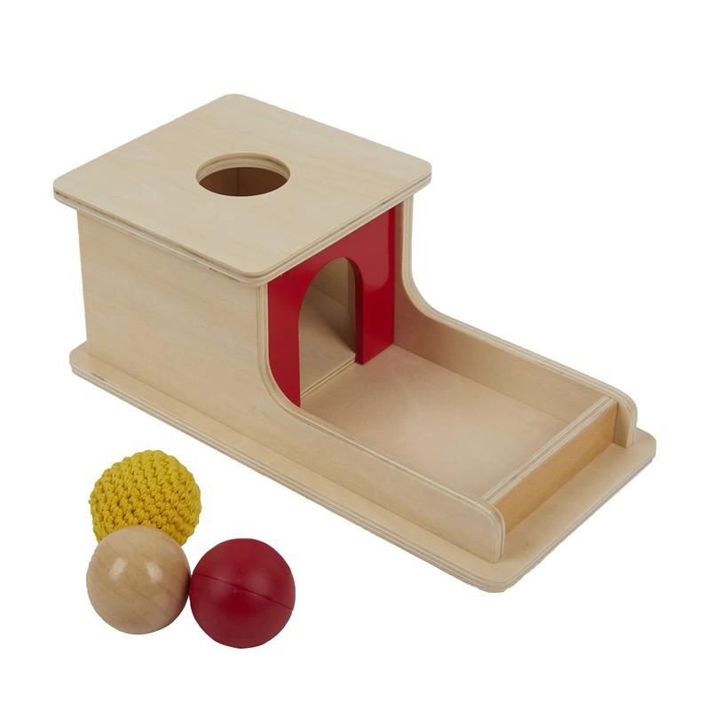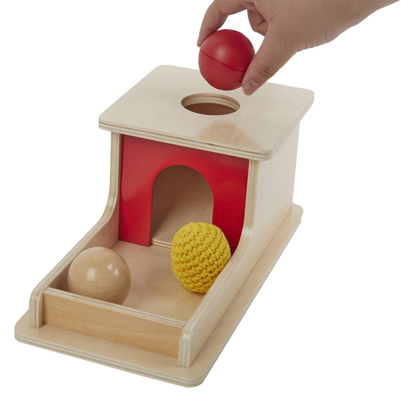 - A child has to drop the little ball into the hole in the box. The ball will roll out of the box and into the attached tray thus allowing the child to experience object permanence by seeing that the ball did not just disappear.