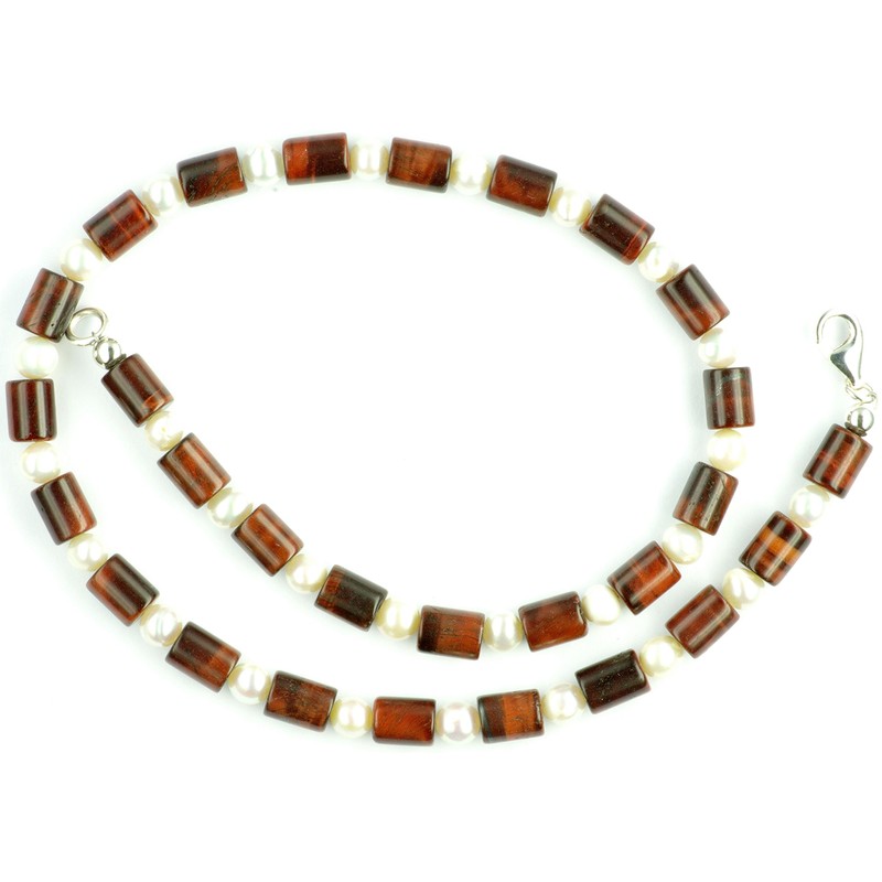 Tiger's Eye Jewellery (Necklace) Tiger's Eye Chain Red with Freshwater Pearls Clasp 925 Sterling Silver Model Number 339, Gemstone, Tigers Eye