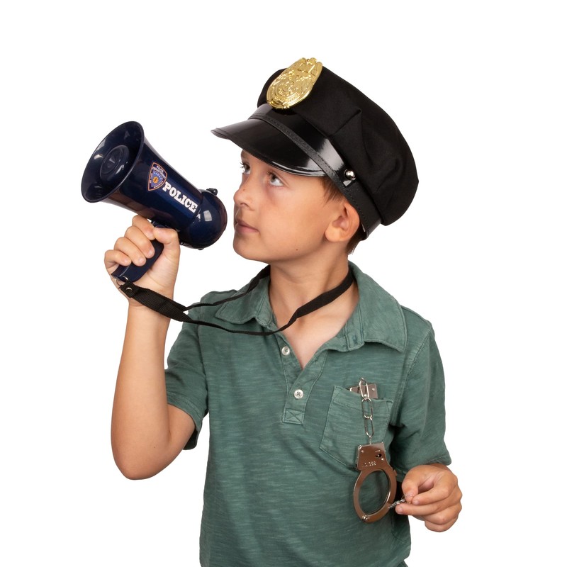 - This set includes police hat, police handcuffs, and a real megaphone.