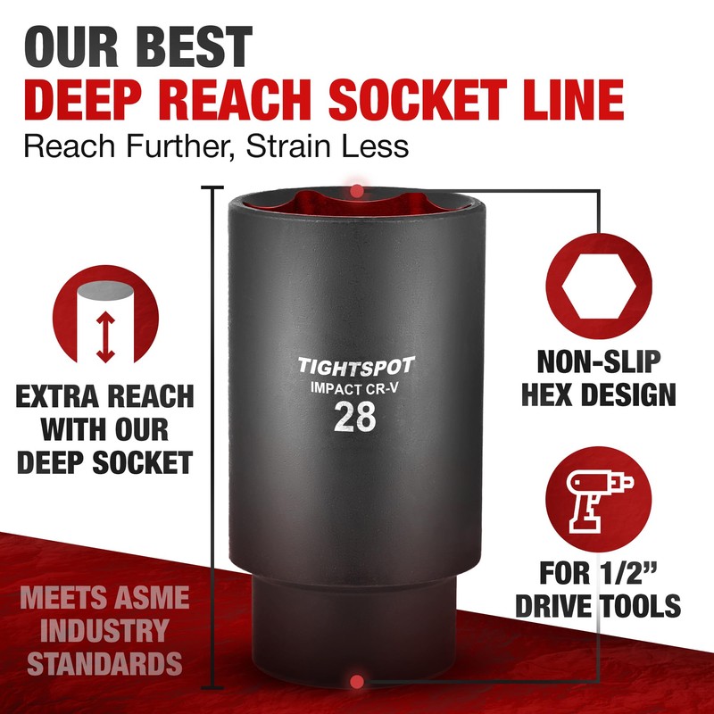 TIGHTSPOT 1/2 Inch Drive - 28 mm Deep Impact Socket with Anti-Rounding 6 Point Design, Heat-Treated CRV Steel, Metric
