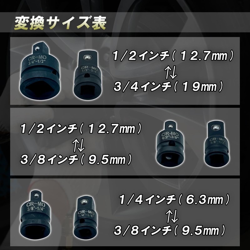- Conversion Size: 1/4 inch (6.3 mm) to 3/8 (9.5 mm), 3/8 (9.5 mm) to 1/2 (12.7 mm), 1/2 (12.7 mm) to 3/4 (19 mm)