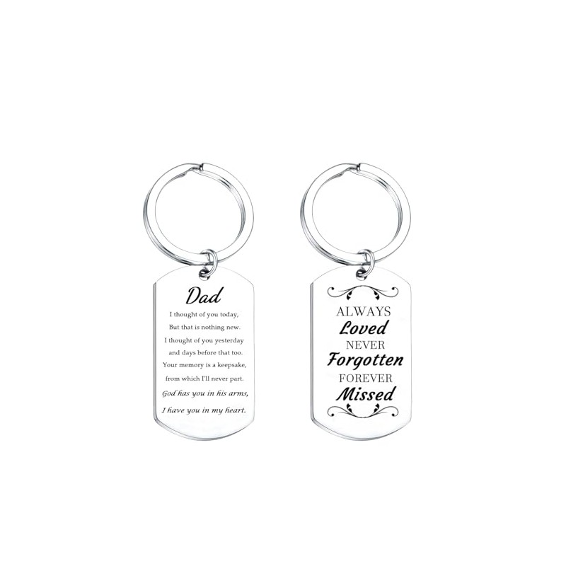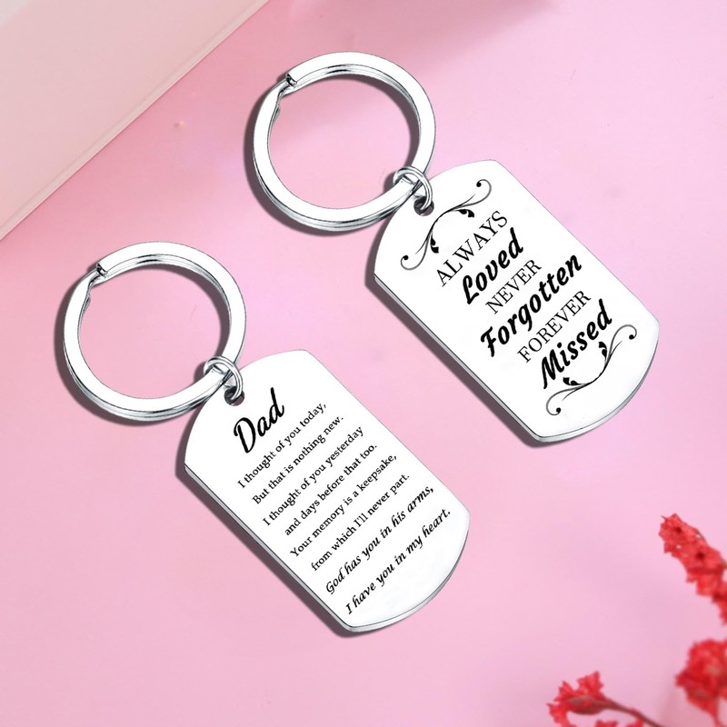 - This dad keyring engraved with: "Dad, I thought of you today, But that is nothing new. I thought of you yesterday and days before that too. Your memory is a keepsake, from which I'll never part. God has you in his arms, I have you in my heart." "Always Loved, Never Forgotten, Forever Missed".Maybe your father is no longer by your side,this little gift will tell him that you miss him,forever.
