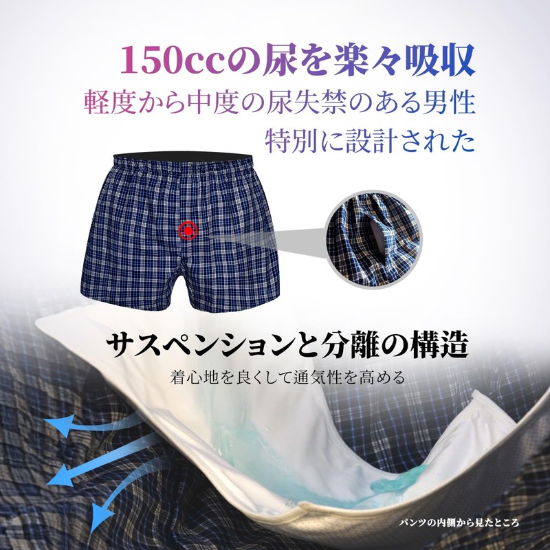 - (150cc Water Absorption) Men's incontinence trunks can absorb up to 5.1 fl oz (150 ml) of liquid. Recommended for mild to moderate urine incontinence. However, please do not use it if you are severe, serious or completely incontinent
