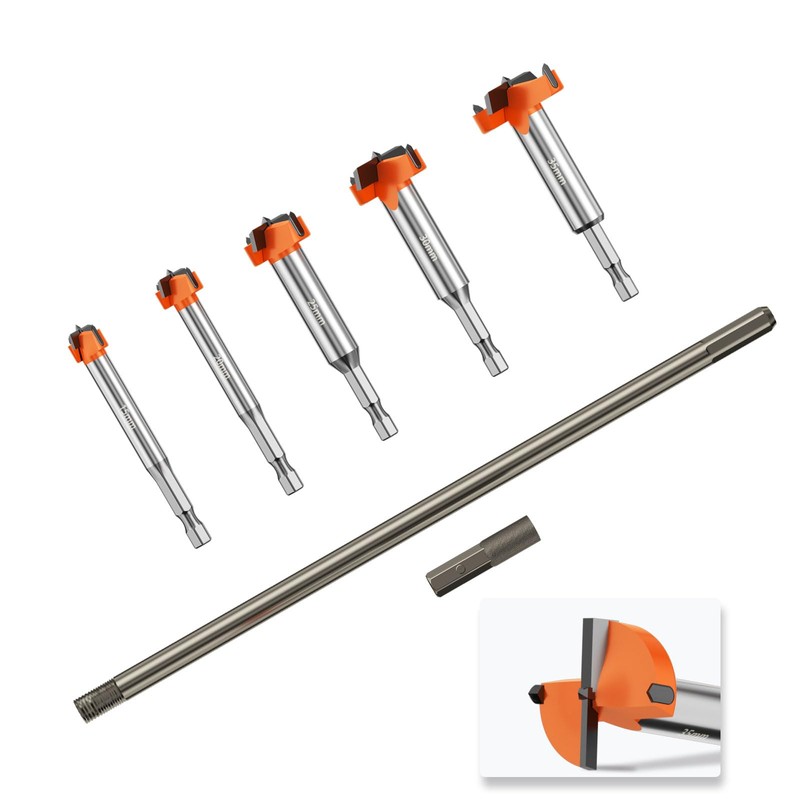 - JUEGO PERFECTO - El taladro de madera de carburo es un abridor de bisagras de 7 piezas, 5 tipos diferentes de brocas con conectores y varillas de extensión (15mm/20mm/25mm/30mm/35mm) , en el proceso de uso, puede utilizar las varillas de extensión y apretarlas con tornillos antes de insertarlas en el taladro para fijarlas, lo que puede ser más eficiente y conveniente para su trabajo de corte y perforación.