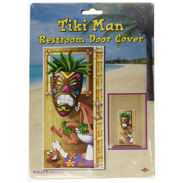Beistle 57318 Tiki Man Restroom Door Cover. This plastic door cover has a funny image of a person wearing a tiki face in the bathroom. It can be used indoors or outdoors. This door cover measures 30 inches wide by 5 feet long.