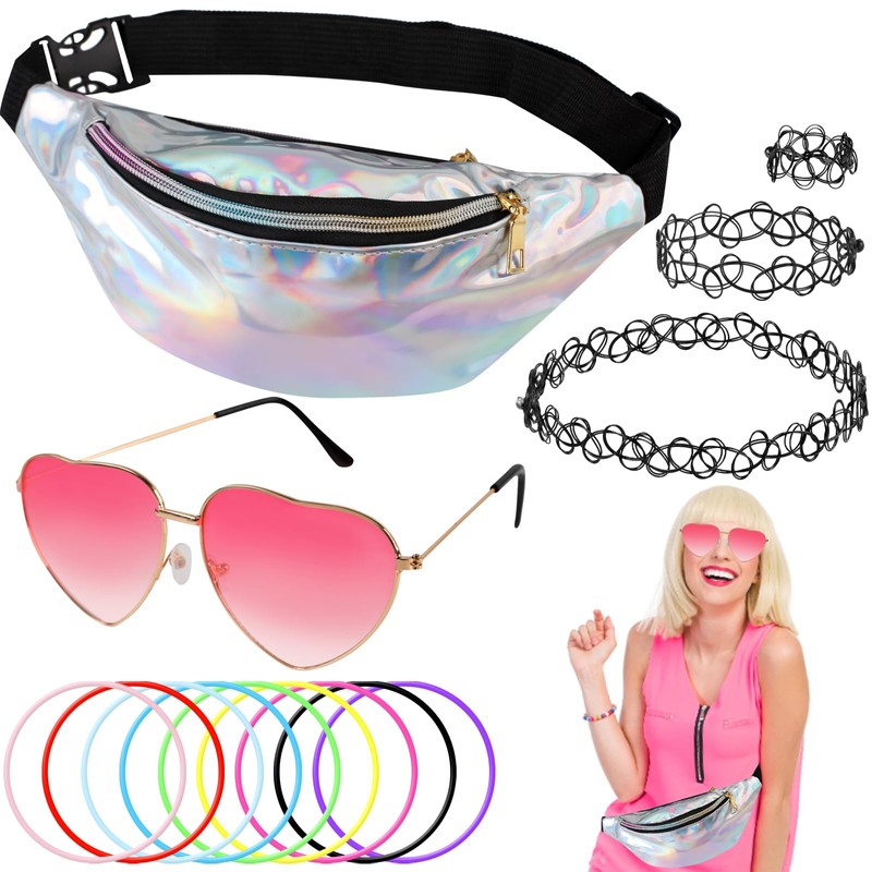- 90s accessory set: this 90s outfit women's set includes pink heart-shaped sunglasses, a silver bum bag, a black collar bracelet with ring and 10 neon bracelets. It perfectly embodies the retro style of the 90s.