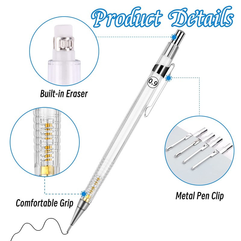 - Comfortable and non-slip: the mechanical pencil body has a non-slip design with thread, which is comfortable to hold and does not slip easily. And the mechanical pencil has a small eraser at the top, which easily eliminates the errors, allows you to work more efficiently.