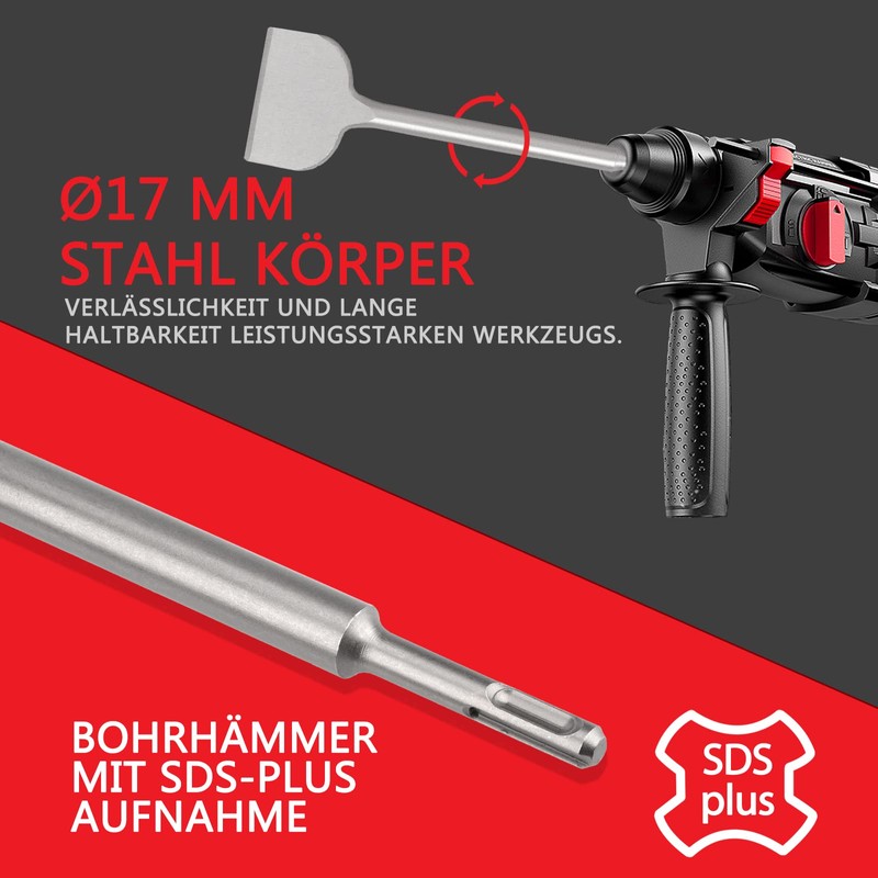 - SDS-plus chisel made of high-strength chrome vanadium steel, inductive heat treatment and special surface coating ensure the highest tool quality for a long time