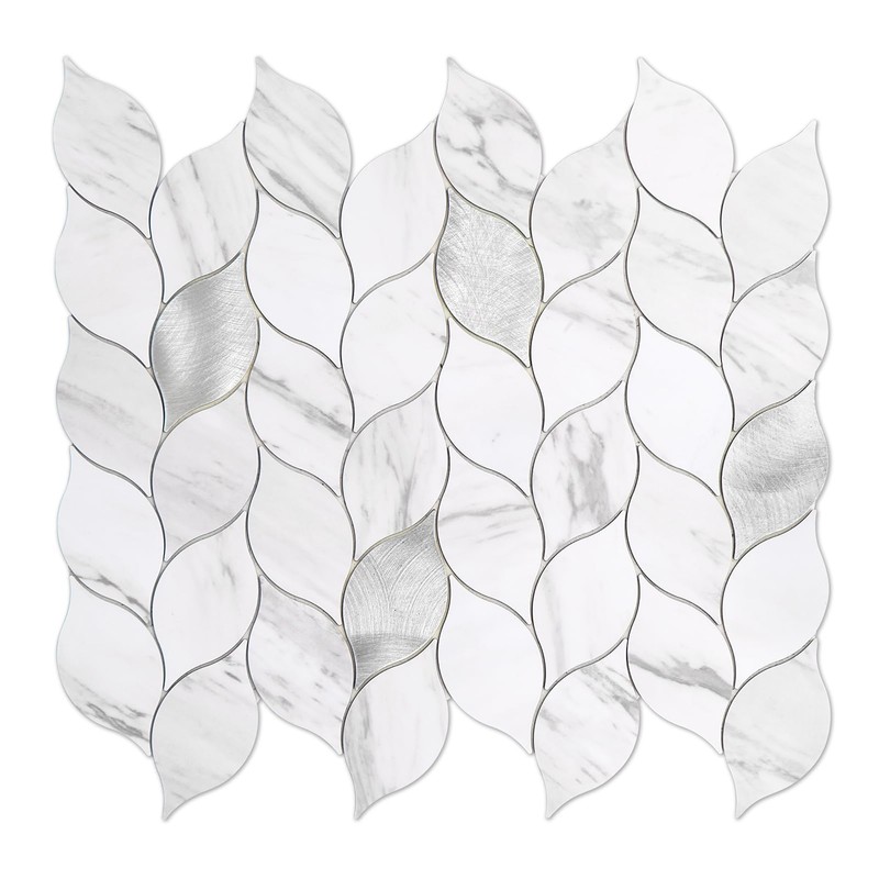 - 【Peel Stick Backsplash】- Realistic white marble texture mixed with silver brushed metal. Leaves design. Each leaf is outlined with gaps. Color: Carrara white marble. Material: PVC composite laminate. Great peel and stick wall tile for backsplash.