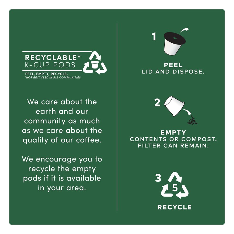 - Doing Our Part: We care about the earth and our community as much as we care about the quality of our coffee. We encourage you to empty the grounds of your used pods and recycle them if it is available in your area.