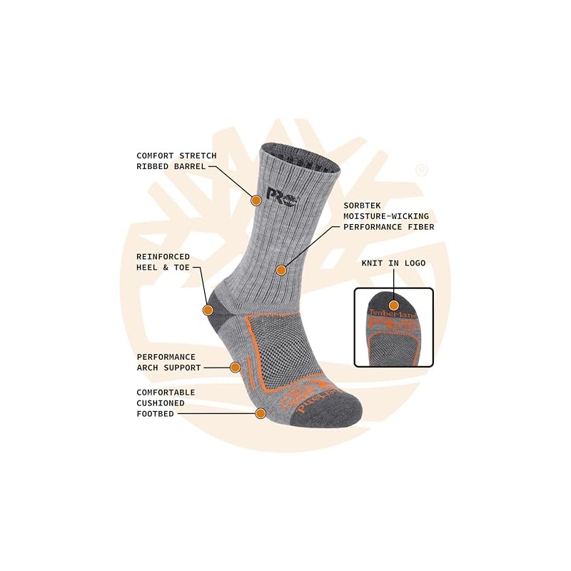 - FEATURES: Timberland Pro crew socks for men are made with you in mind. These men’s socks provide you with additional arch support, cushioned footbed, mesh venting, and moisture wicking material