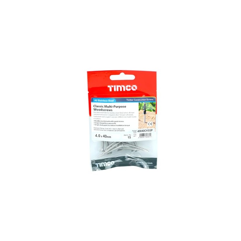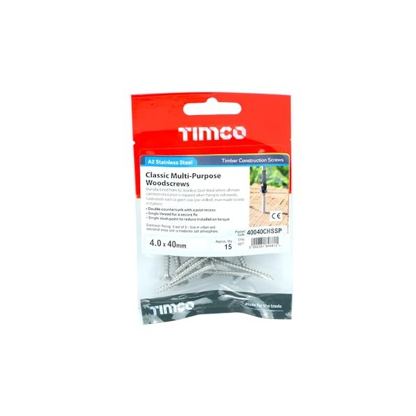 TIMCO Classic Multi-Purpose Countersunk A2 Stainless Steel Woodcrews - 4.0 x 40