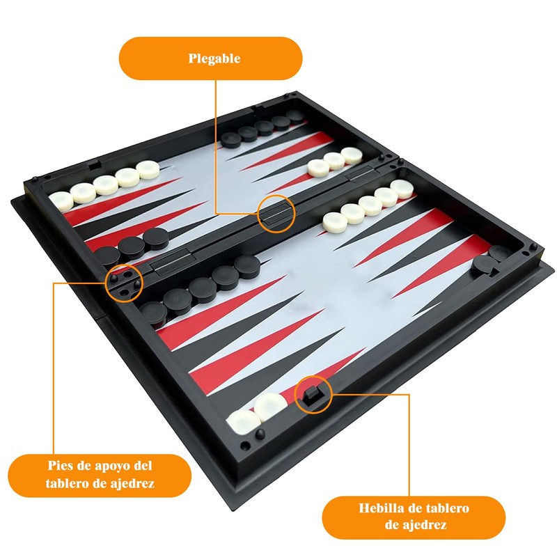 - 【Alta jugabilidad】El juego de ajedrez plegable 3 en 1 ofrece una cómoda experiencia de juego. Dos tableros, tres experiencias de juego diferentes, ajedrez, damas y backgammon, muchas formas de jugar y mucha diversión. Tamaño abierto: 10 x 10 x 0,8 pulgadas, plegado: 10 x 5 x 1,6 pulgadas.