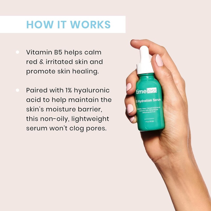 Add our Timeless Skin Care Vitamin B5 Serum to your skincare routine, and experience the moisturizing, calming, and healing effects of this power-packed product. The vitamin B5 serum is for all skin types but especially helpful for oily and sensitive skin. Our serum formula is paraben-free, sulfate-free, fragrance-free, dye-free, cruelty-free, and vegan.