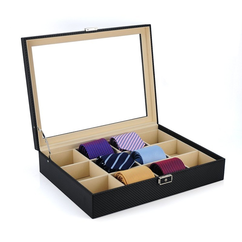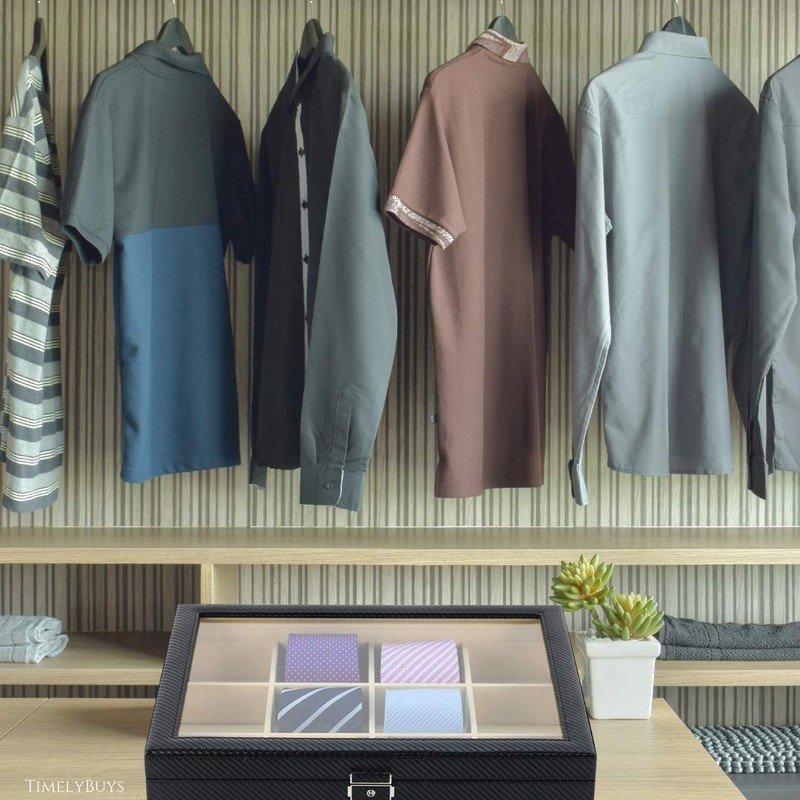 - TIMELYBUYS TIE CASES: Versatile 12 TIE CASE for men. TimelyBuys display cases are known for their first-class workmanship, material, and design. Coordinates beautifully with our black carbon fiber watch and eyeglass display cases.