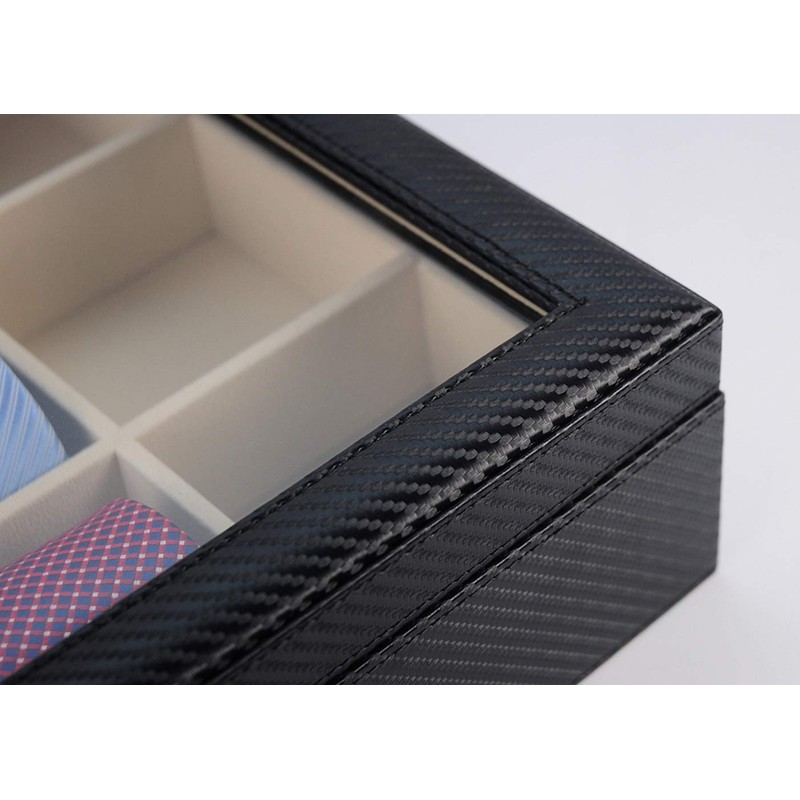 - CONSTRUCTION: Stunning black carbon fiber case keeps ties organized, wrinkle and dust-free. Glass top with lock and key for added security.
