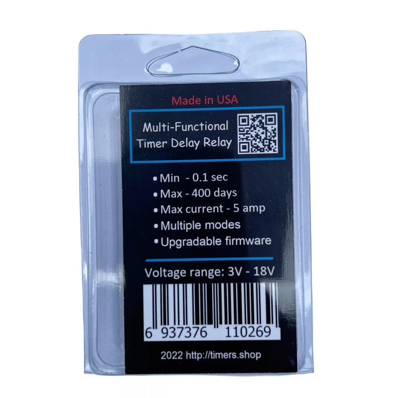 The timer has optional trigger control with either high or low signals. It can handle up to 5 amp continuous current which makes it applicable to a wide variety of low voltage applications. A built-in flyback diode allows inductive loads to be directly connected to the output.