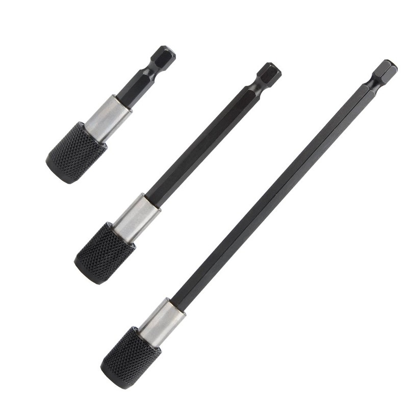 **Magnetic Bit Holder with Adjustable Collar of TIMESETL** Ever had the problem of the drill bit was not long enough to reach what you were trying to drill? This extension set solves that issue. It is a three-piece ¼” Hex Shank set in sizes of 60mm, 100mm and 150mm. That is approximately 2.5", 4" and 6" of added length you can choose from. They are made of chrome vanadium steel (CR-V) and heat treated to provide maximum strength and wear resistance. This set will allow you to get into those tight spaces much easier. It is a nice set for your handyman. **TIMESETL Magnetic Extension Bit Holder - High Quality** Specifications: Shank: 1/4" hex shank (6.35mm) Length: 60mm(25g), 100mm(32g), 150mm(40g) Color:Black and Silver Quantity: 3pcs Material: CR-V Stainless Steel **TIMESETL Screwdriver Bit Holder with Magnetic Tip - Lock-n-Load Quich Change and Release** Suitable for drill, screwdriver, batch head and other to transfer. Extend all kinds of 1/4" screwdriver bits, screwdriver head conversion use **Delivery** 3 x Magnetic Screwdriver Bit Holder