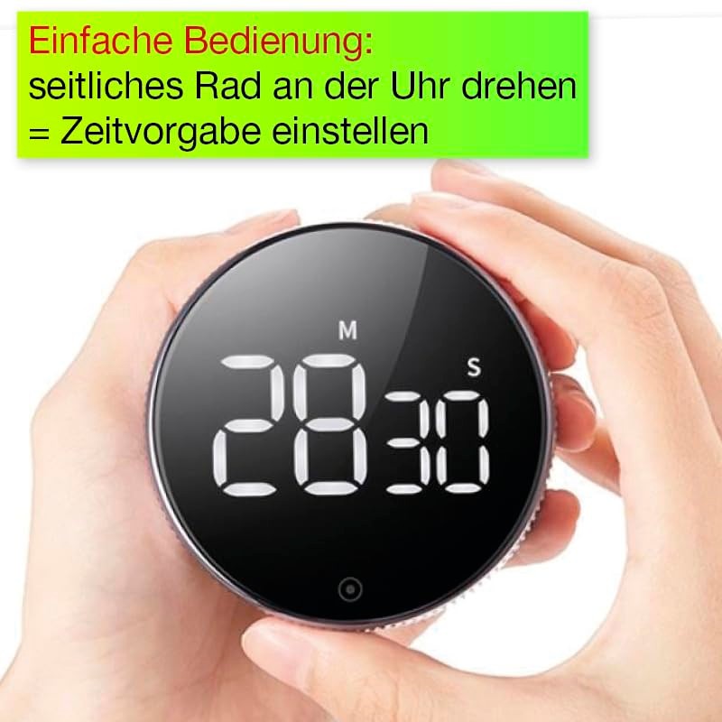 - The silver housing ring of the "Digi Disc" is not only name-giving, but central control element. By turning this ring to the left or right, the time is set, by tapping the LED display, the clock starts. The maximum adjustable time is 99 minutes and 55 seconds.