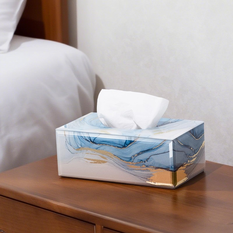 Timetrace Tissue Box Cover, Swirled Blue & Gold Marble Glass Rectangle Tissue Holder, 10.15x5.7x3.7 Inches, Tissue Cover for Living Room, Bedroom, Dining Room, etc.