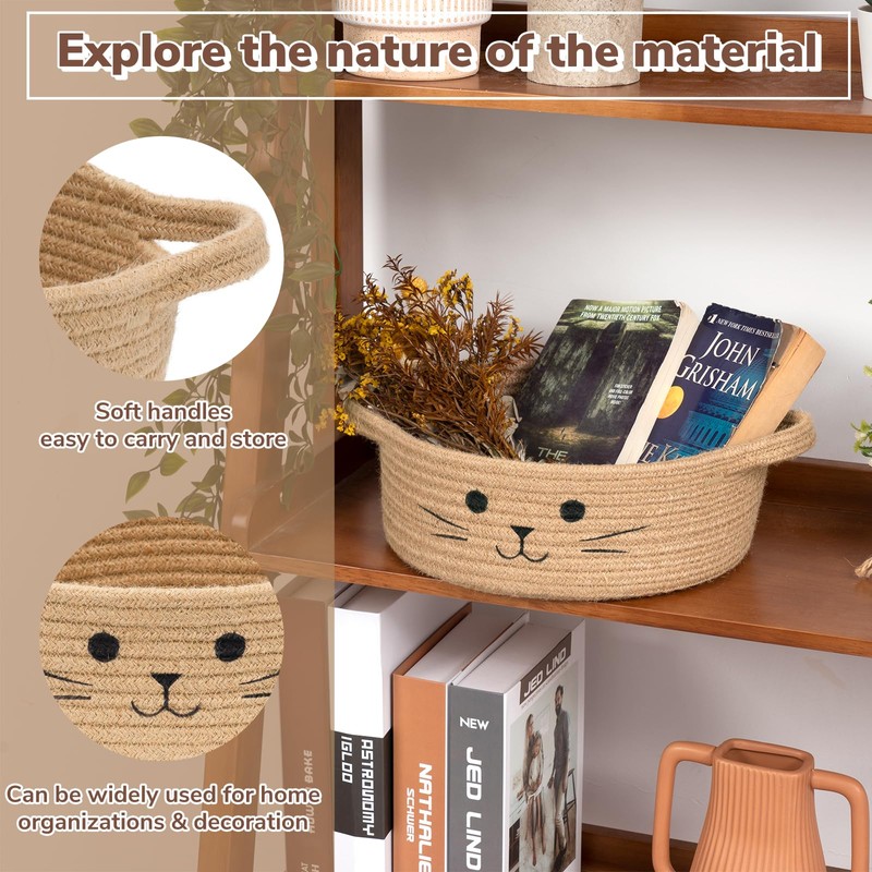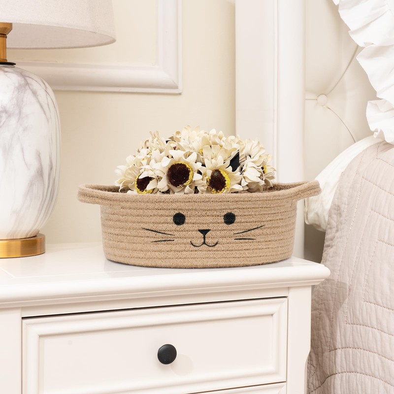- Unique Cartoon Design. This jute basket is hand embroidered with a cat’s happy face. Perfect for home storage or decoration, this basket can be used in a child's bedroom, bathroom, nursery, playroom table or on a shelf