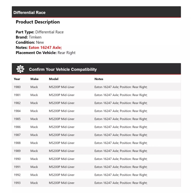 Timken For 1980-82, 1984-93 Mack MS200P Mid-Liner Differential Race Rear Right Timken