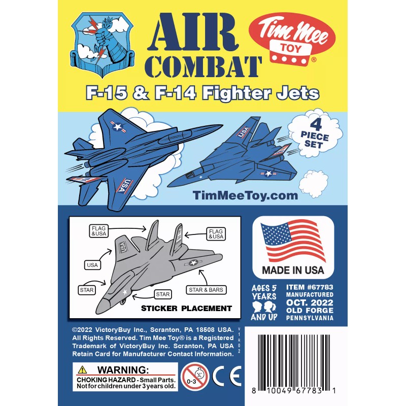 The Tim Mee Toy F14 & F-15 Aerial Combat Fighter Jets are ready to provide maximum air support to your plastic army men on the ground. This 4 piece set of aircraft are proudly manufactured in the United States and each plane measures 6.9 inches long with 4.6 inch wingspan. Approximately 1:100th to 1:144th scale and made from slightly stiff Blue color HDPE plastic with a medium amount detail and a little flashing. Also includes optional sticker sheet.