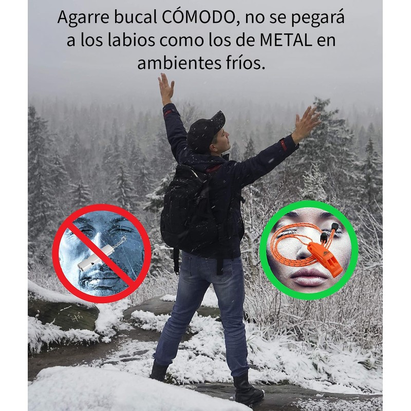 - POTENTE SONIDO DE 120 DB CON DOBLE TUBO: Silbato de señal de tono alto con cámaras duales que emite un sonido penetrante audible a más de una milla. Ideal para emergencias, rescates y deportes al aire libre donde cada segundo importa.