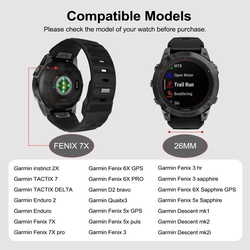 • CONGRUOUS MODELS - The width of this band is 26mm. Smartwatch band perfectly fits: Garmin Fenix 7X, Fenix 7X pro, Fenix 6X, Fenix 6X pro, Fenix 6X Sapphire GPS, Fenix 5X, Fenix 5X plus, Fenix 5x Sapphire, Fenix5x GPS, Fenix 3, Fenix 3hr, Fenix3 sapphire, Descent MK1, Descent mk2, Descent mk2i, D2 Delta PX, D2 Charlie/bravo Smartwatches. If you're not sure about the size of your watch, please check your watch model and collate the compatible models we listed to select your best match.