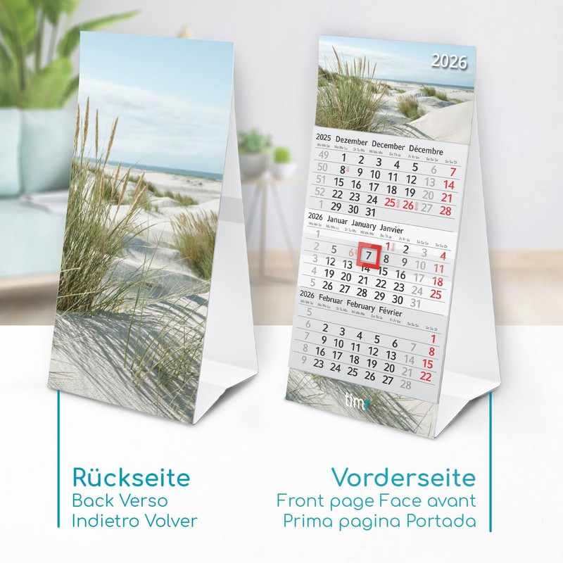 - Three-month calendar 2026 - three months always in view, on a tear-off pad (block size: 95 x 135 mm). The overall size is 9.5 x 19.8 cm. High-quality paper quality of the calendar sheets and a sturdy cardboard body for a good stand on the desk. Designed, produced and packaged in Germany.