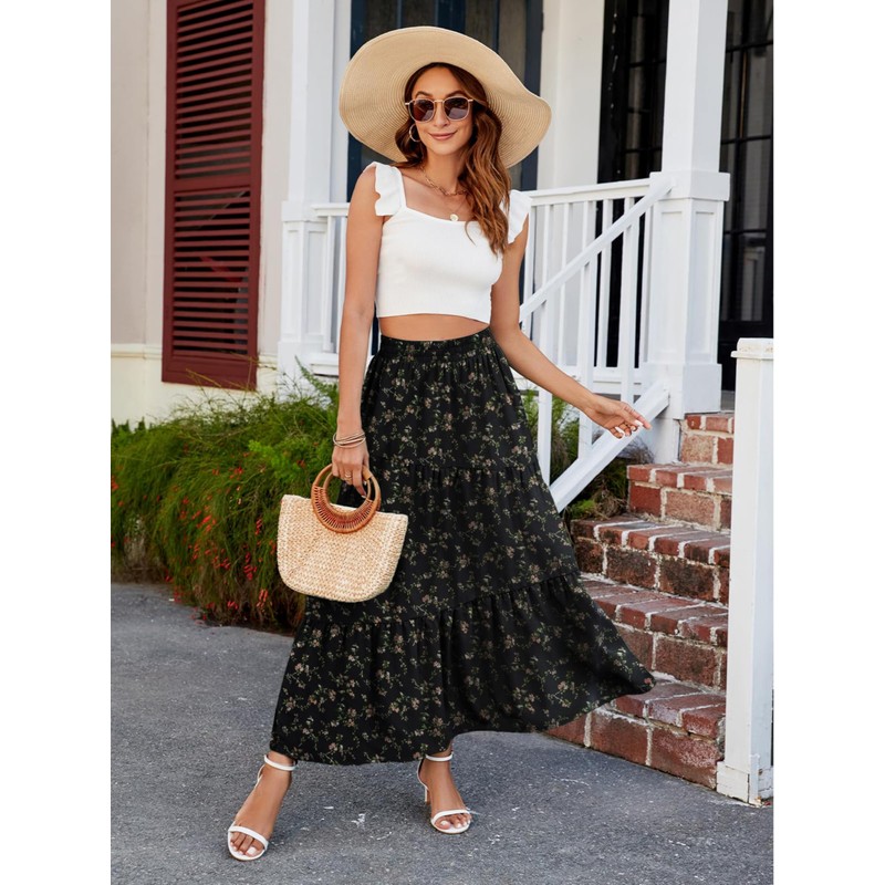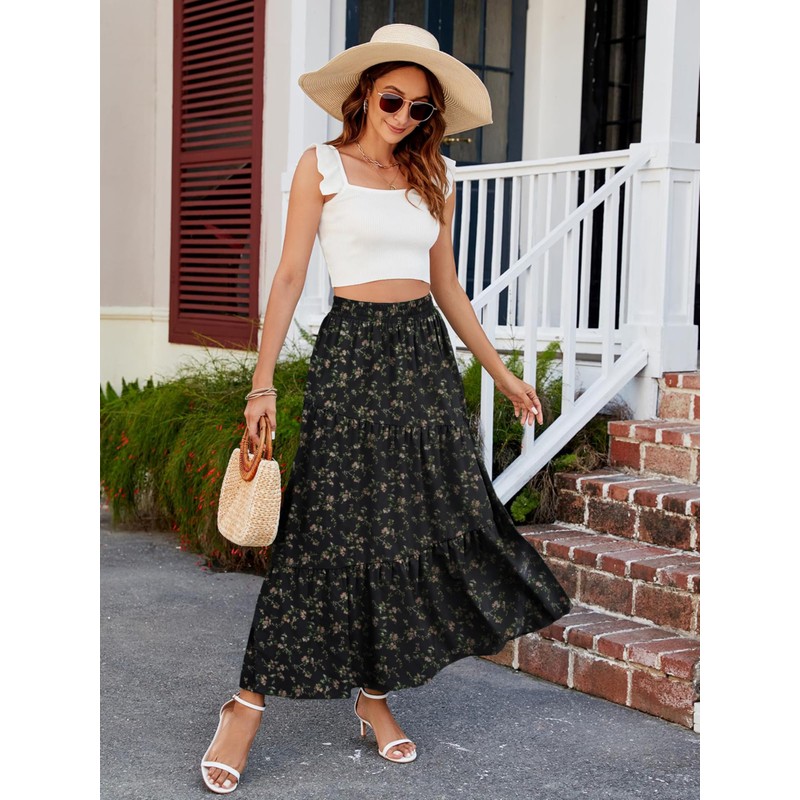 Features: Womens Summer Long Maxi Skirt / A-Line / Elastic High Waist / Tiered / Pleated / Soft and Skin-Friendly Material / Solid Colors / Floral skirt / Boho / Casual Holiday Party Skirt