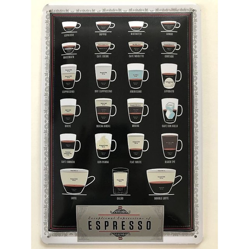Tin Sign 20 x 30 cm Curved Coffee Espresso Varieties Board Overview Decorative Gift Sign