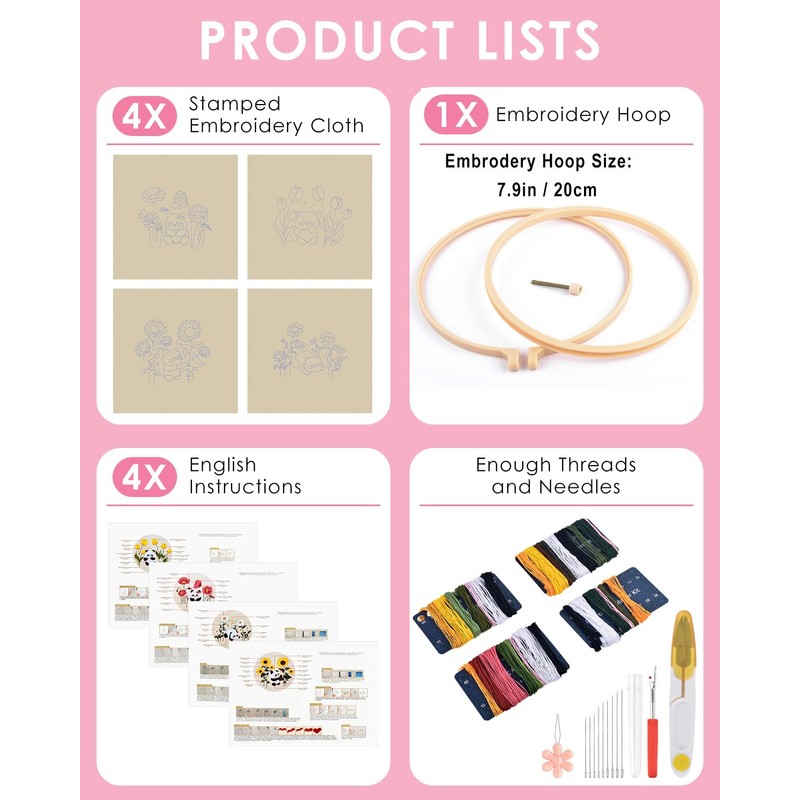 • 【What Will You Get】1* embroidery hoop, 4* embroidery fabric with pattern, 4* instructions, 1* scissor, 1* needle threaders, 1* seam ripper, enough color threads and embroidery needles.