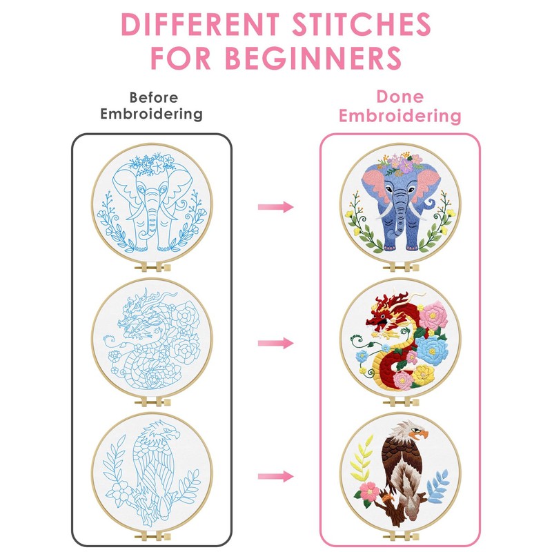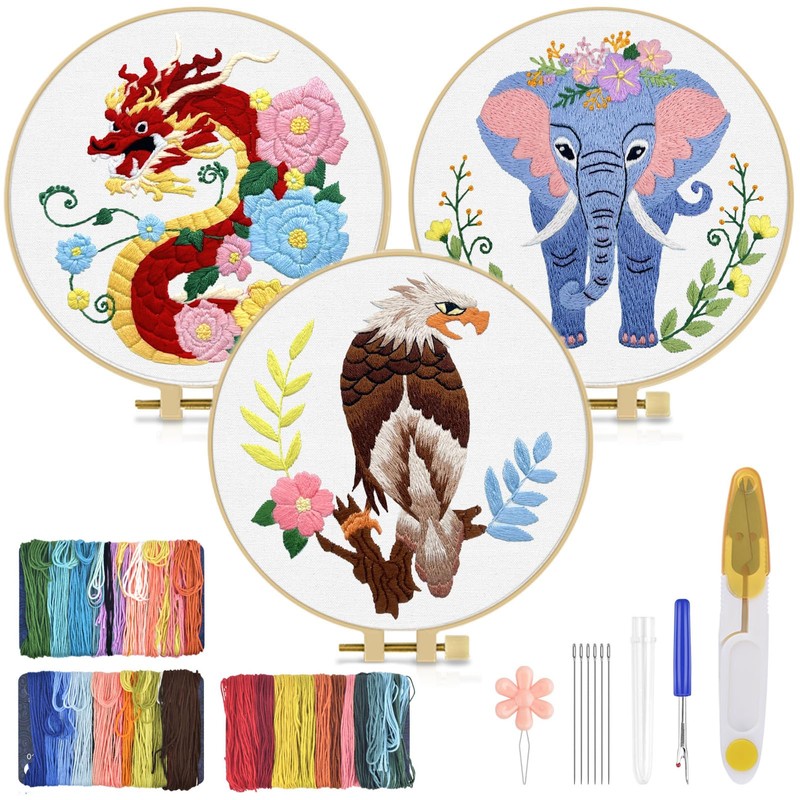 - 【What Will You Get】1* embroidery hoop, 5* embroidery fabric with pattern(Owl, Hummingbird, Butterfly, Dragonfly, Honeybee), 5 set of enough color threads, 10* embroidery needles, 5* instructions, 1* scissor, 1* needle threaders, 1* seam ripper.