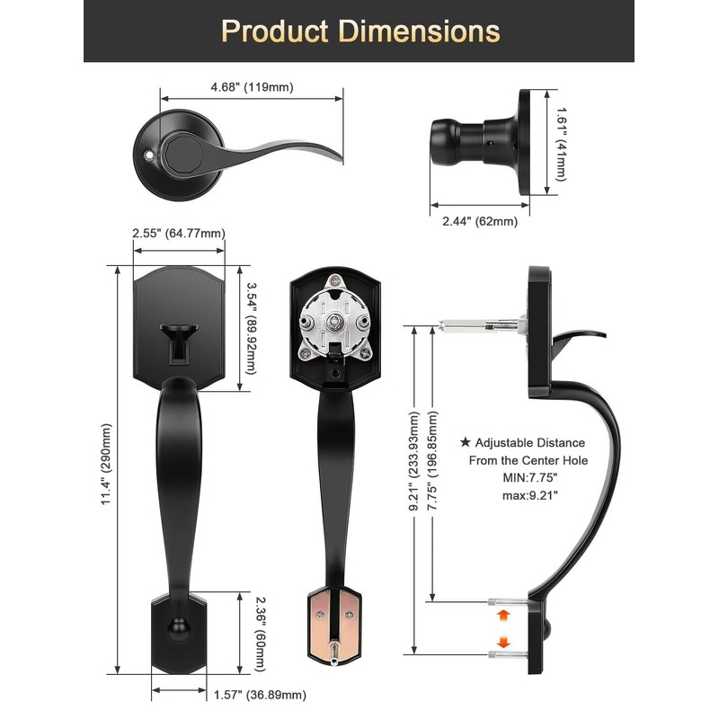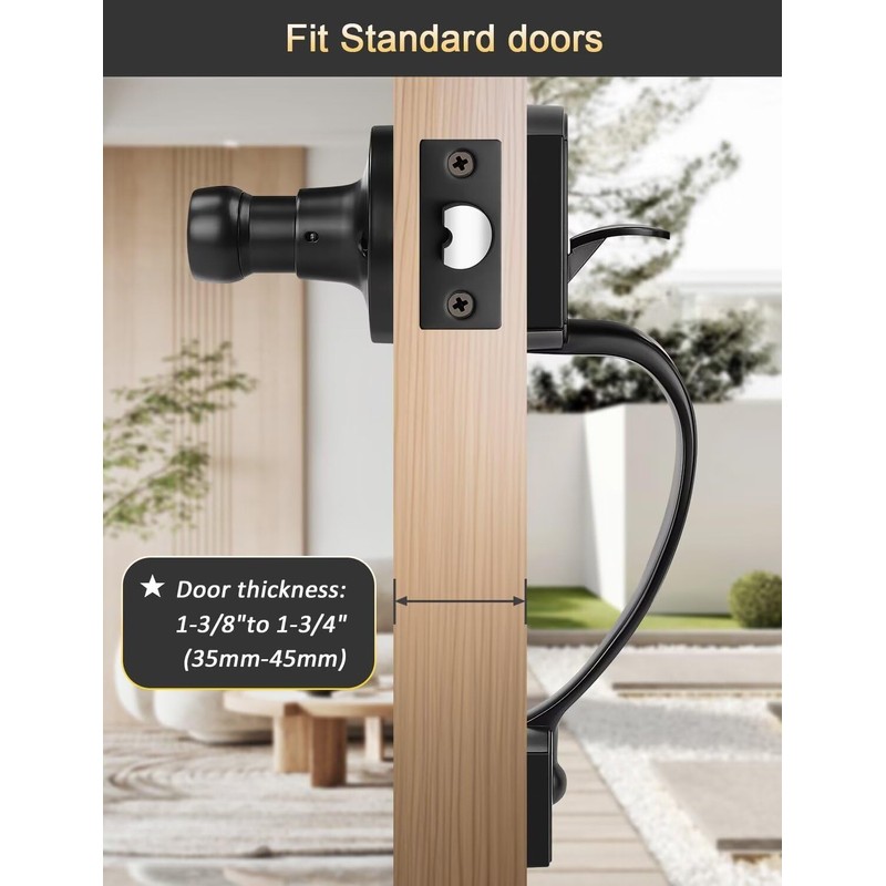 - 【Fit Standard Door】Universal latches fit 2-3/8" (60mm) or 2-3/4" (70mm) backsets. Door thickness range: 1-3/8" (35mm) to 1-3/4" (45mm) thick. Handle Dimension: External Handle: 10-1/5" X 2-5/9"; Center-to-center distance for external handle: 7-3/4"; Internal Lever: 2-5/9" X 4-7/10"