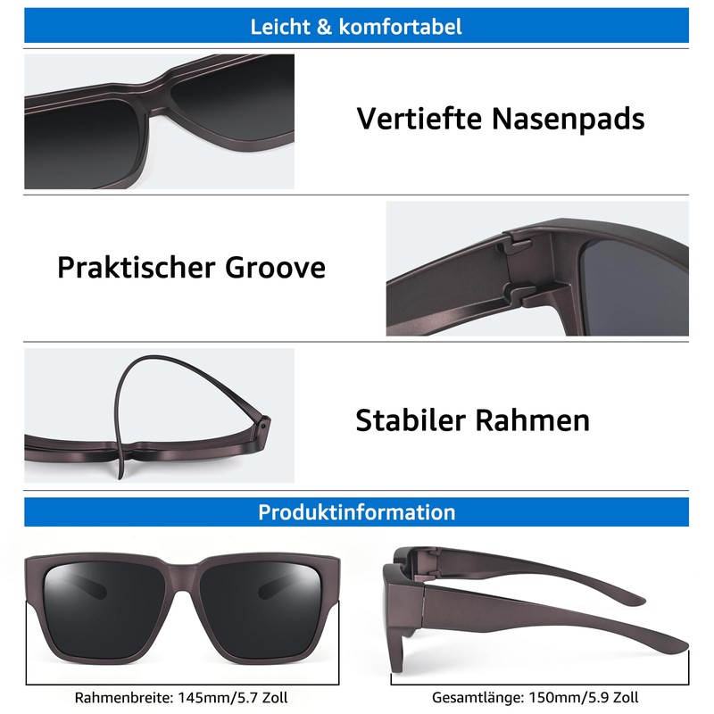 - Polarized lens with UV400 protection: effectively block glare reflections and restore natural colours. The UV400 protective coating protects the eyes from UVA/UVB/UVC rays. Clear vision and eye protection for everyday use.