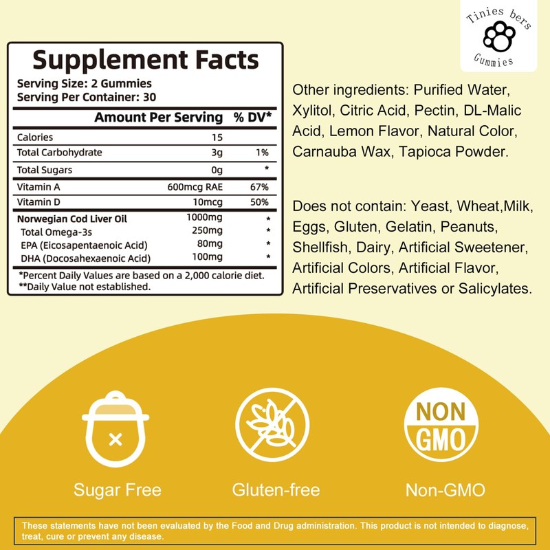 - Yummy and Health: Tinies bers cod liver oil gummies have soft texture and lemon flavor. GMP compliant and Lab-tested. Pectin, non-GMO, and gluten-free gummies are the promises we Tinies bers make! The EXP date is marked on the label of each bottle.