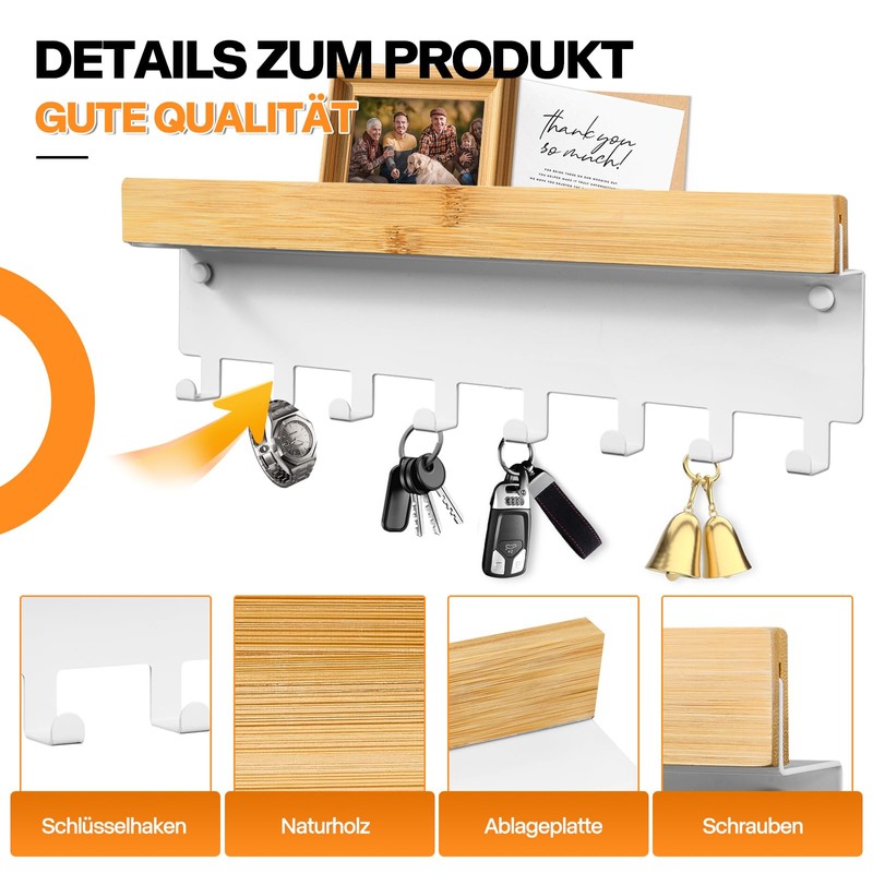 - Key board with shelf: the key hanger has a practical tray design and can be used as a wall shelf for placing letters, picture frames and wallets. The 8 hooks at the bottom can attach keys, umbrellas and dog leads to avoid mess and allow you to easily and quickly find what you need